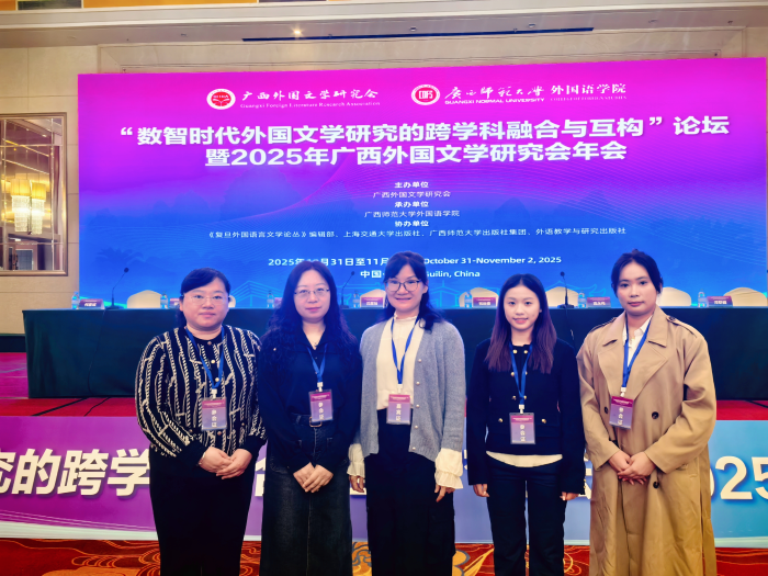 金秋十月,桂花飘香。10月31日至11月2日,由广西师范大学主办的“数智时代外国文学研究的跨学科融合与互构”论坛暨2025年广西外国文学研究会年会在桂林隆重举行。来自全国多所高校的专家学者齐聚一堂,共话外国文学研究的新趋势与跨学科融合的新路径。学院院长曹治柳、王晓惠教授、杨喆博士及翻译硕士研究生刘雅琳和周柳梅参加了此次论坛和研讨会,曹治柳受邀主持“文化主体性与理论创新”平行分论坛汇报并作点评。
