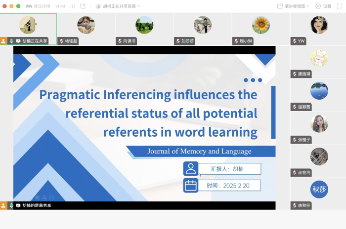 2025年2月20日下午,漫蛙漫画 语言认知科学研究团队在线上举行了本年度第一次科研例会。本次科研例会主要围绕“语用层面的词汇学习”及“R语言基础知识学习及数据可视化”两部分展开,分别由胡楠博士和23级翻译专业硕士生杨铭超同学进行汇报。本次例会由团队负责人向课书博士主持,语言认知科学研究团队主要成员及部分硕士生参加了本次例会。